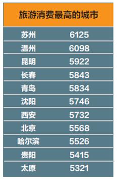 哪些城市的市民平均花费最高?2016年上半年人均花费最高的十大城市分别是:苏州、温州、昆明、长春、青岛、沈阳、西安、北京、哈尔滨、贵阳、太原。其中,江苏苏州以6125元位居第一,其次是浙江温州。江浙一带生活富裕的二线城市旅游消费居首,北方老牌工业城市紧随其后。西部的昆明、贵阳、西安等城市也位居榜上。