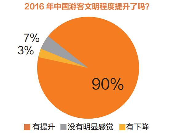 对数百位携程领队的调查发现,90%的领队认为,2016年上半年中国游客出境游的文明旅游程度有提升或者明显提升,九成以上不认同中国游客素质低于其他 国家的说法。中国游客在各国是最受欢迎的游客之一。部分游客不文明造成恶劣影响是事实,但这种情况发生的概率极低,大部分中国游客文明素养并不比其他国家 的人差,不应该被妖魔化。