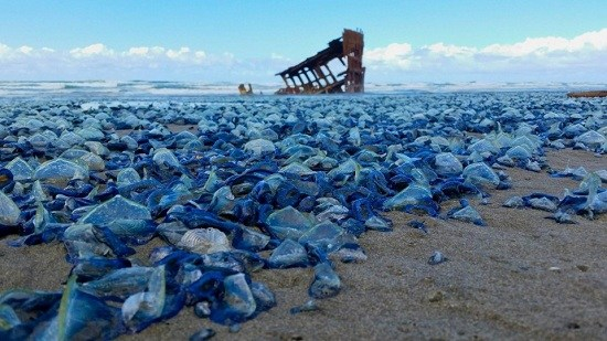 据悉,登陆“屠牛湾”的这些蓝色小怪物名为帆水母。它们的浮囊体呈青蓝色,帆板无色透明,随风或海流漂浮于水面。虽然它们是大名鼎鼎的杀人僧帽水母的近亲,但却不会对人类造成致命威胁。