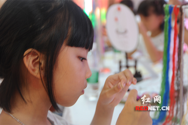 “湘绣学堂”,小朋友在现场学习刺绣。
