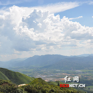 图为东岗岭上的风力发电项目,从这里可以俯瞰到汝城大坪镇。
