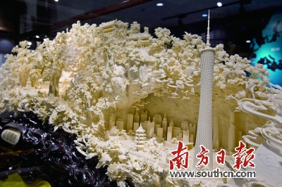 本次展览亮相的牛骨雕作品《南国明珠》就是其中一件代表作。作品将广州新旧中轴线上的著名景点,集中在有限的空间里一一展现,色泽质感玲珑剔透,令人惊异。除骨料外,张民辉还积极尝试运用猛犸象牙、河马牙等材质进行创作,为牙雕技艺开拓新的空间。