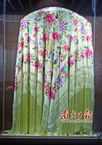 在西班牙婚礼或重大节日的场合中,人们经常会看到身披色彩艳丽、图案繁复的刺绣大披巾的西班牙女郎。欧洲人将这种充满异国风情的刺绣披巾称为“马尼拉披巾”。但鲜为人知的是,这些披巾中有不少是来自广州的绣品。