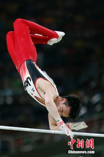 当地时间8月8日,2016里约奥运会男子体操团体决赛在里约奥林匹克体育馆进行,预赛第一的中国队决赛中未能延续好状态,最终收获一枚铜牌。日本队获得本届奥运会男团冠军,俄罗斯队获得亚军。图为TANAKA Yusuke在单杠比赛中。中新网记者 盛佳鹏 摄