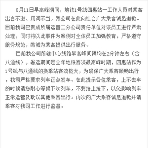 近日,一段关于地铁工作人员辱骂乘客的视频在网上热传。视频中一穿地铁制服的女工作人员和一名男子对骂,引发附近乘客围观。今天下午,北京地铁官方微博回应称,8月11日早高峰期间,地铁1号线四惠站一工作人员对乘客出言不逊、用词不当,我公司在此向社会广大乘客诚恳道歉。