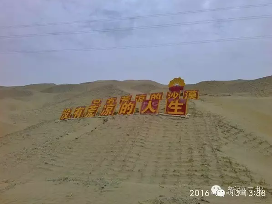 远处,一些镶嵌在沙漠里的红色大字,再次吸引记者驻足拍摄。也恰好让记者们偶遇了来自安徽的周妙仙。他不远万里,骑行摩托车穿越塔克拉玛干,热爱生活、敬畏自然、迷恋新疆以及对祖国大好河山的向往,给记者们带来强烈的冲击感。穿越楼兰的故事越来越精彩,正好印证了这些红色的大字“只有荒凉的沙漠,没有荒凉的人生!”