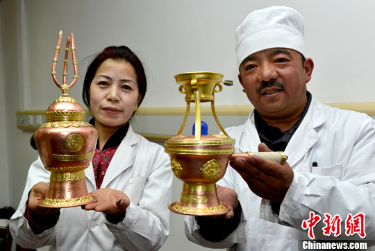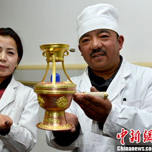 资料图西藏藏医院的工作人员展示改良后的藏医外治医疗器具。中新社发 李林 摄