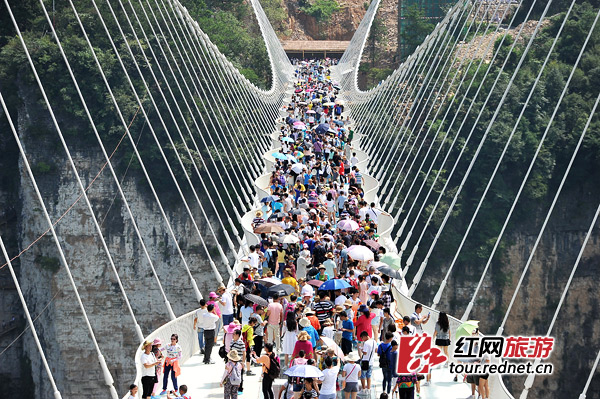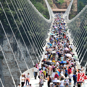 早前,张家界大峡谷玻璃桥20日试运行的消息一公布便引起轰动,由于上桥人数限量8000名,玻璃桥门票早早预订一空,众多外地游客19日晚就守候在景区门口排队等待购买散客票,甚至通宵达旦。当日玻璃桥开放接待后,游客门更是蜂涌而来。为确保接待秩序,景区已及时发布公告暂停当日接待。