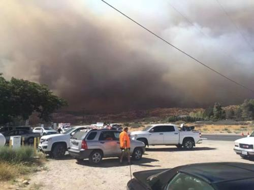 从拉斯维加斯回洛杉矶的中国游客在15号公路附近休息站休息,看得见浓烟蔽日。(美国《世界日报》)