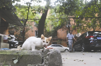 8月22日,红瓦寺街共和村内,一只流浪猫在小区内吃食