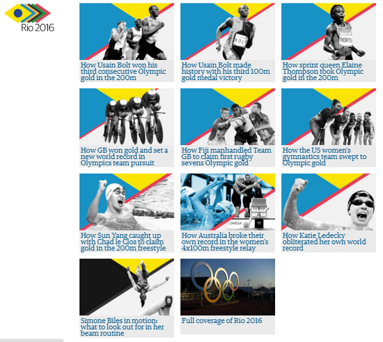 放眼国内外各大平台的报道,可视化妥妥成为了本届里约奥运会的一大特色,不难看出,从文字向图片、动画向更多维度信息网的搭建,国外的各大媒体已经进行了积极的探索。看来为了能够在这场奥运报道大战中脱颖而出,国内外各媒体都是纷纷使出了体内的洪荒之力,奥运精神的“更高、更快、更强”在媒体领域同样体现的淋漓尽致。