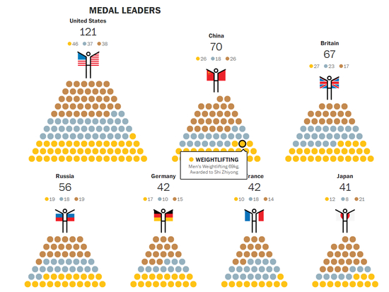 华盛顿邮报开发了整版的网站用来投放奥运会得奖情况。沿界面下滑,可以看到几国奥运金牌的小人身披本国国旗,站在金牌“金字塔”的顶端俯瞰众人,仿佛金牌榜的争夺战也是一场奥林匹克重磅项目。八个主要国家的金字塔图清晰明了,以金牌为底座,银牌和铜牌依次向上堆叠,比起传统数字列出的金牌榜更加有趣生动。