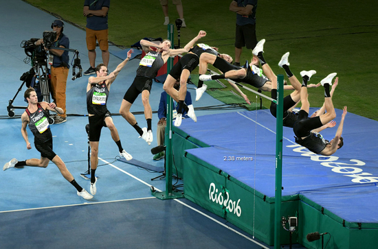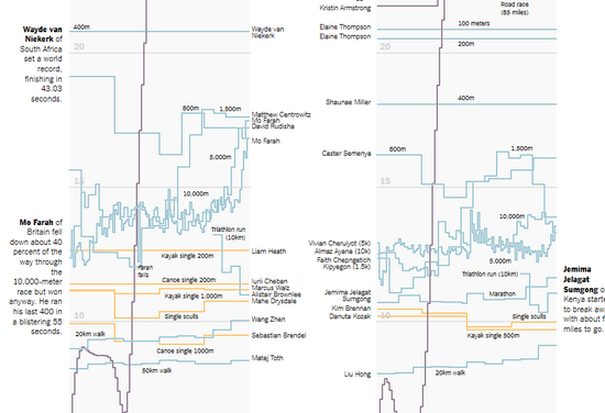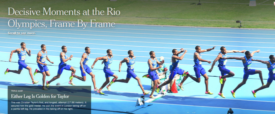值得一提的是,纽约时报的可视化探索不仅仅聚焦于单一,似乎缺乏温度的单一数据维度,而且把镜头聚焦于每一个精彩画面。图中是美国三级跳比赛冠军Christian Taylor在赛场的精彩瞬间的每一个定格。纽约时报将一个个动作流畅的衔接,不遗漏每一个精彩。体育爱好者可以去观察揣摩他的跳跃动作与技巧,而观众们则感受到令人震撼的速度与力量之美。