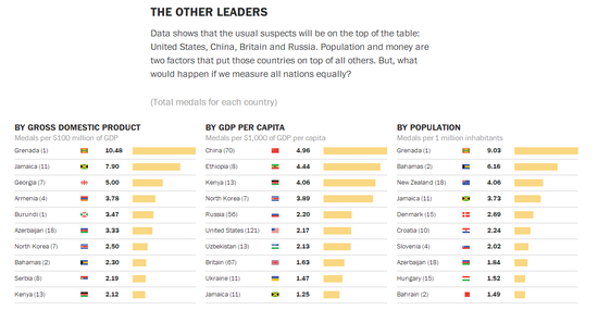 值得注意的是,华盛顿邮报可能认为按照总金牌数表彰各个国家显得有些“不公平”,所以他们并未仅仅关注到常年包揽金牌的“常胜国家”。通过不同的计算方式对总金牌数并不显眼的国家进行展示。向下滑动页面,可以看到其他三个“金牌榜”,纳入了GDP、人均GDP、人口三大变量进行计算,换一个角度向那些同样值得尊敬的国家致意。