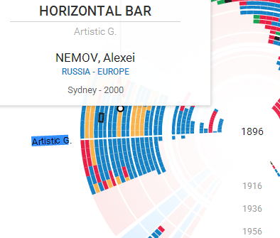 在1984年,由于苏联被禁赛,中国队和日本队凭借优秀的表现填补了空白,因而那一届的冠军没有来自苏联的选手,因而没有蓝色部分。Github将这些值得注意的小细节填补到备注中,在单一的数据维度中增加了许多有趣的解析。