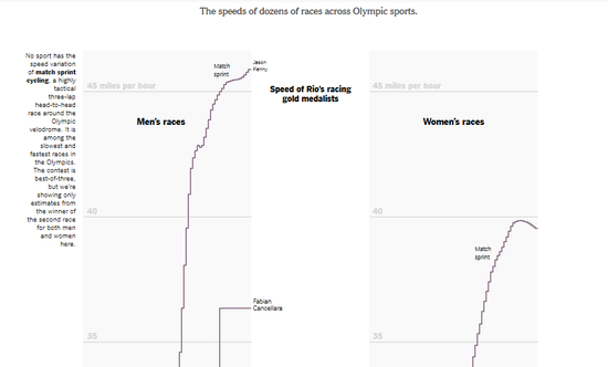 不仅可以纵向比较,横向来看,根据同一比赛项目的男女比对,女性在速度和爆发力上均弱于男性,但女性均速更为稳定。纽约时报的折线图提供了较为丰富的数据,便于从不同的切口观察。