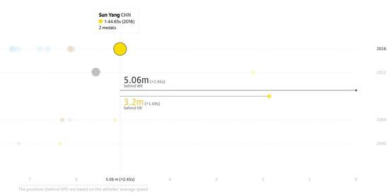 另外,还将2000年到2016年五届奥运会上,在该项目的运动选手、当时的成绩与世界纪录对比情况一一列举。一张动态图信息量涵盖全面,可以让大家一眼看出运动员是如何一步步突破极限,赛出最佳成绩的。