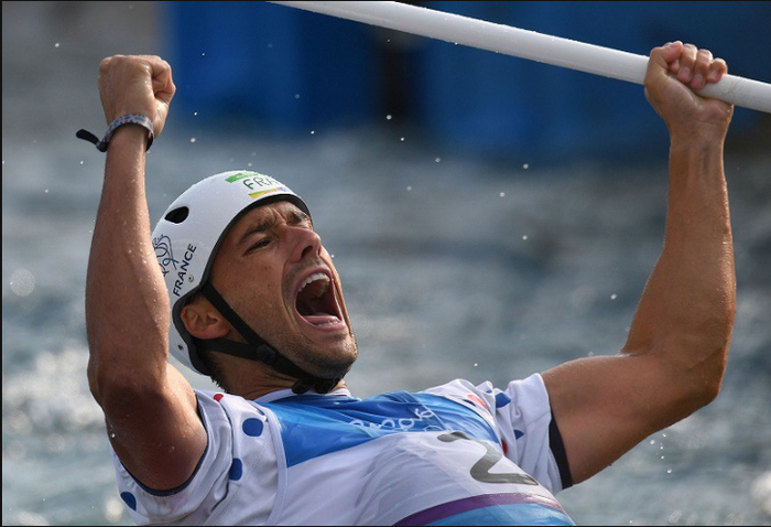 12.男子单人划艇决赛,法国选手加尔加德-夏努特夺冠。2016年8月9日,三浦博之摄于里约白水体育场。