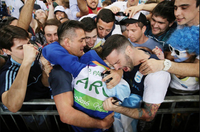 20.女子柔道48公斤级决赛,阿根廷选手帕雷托夺冠后激动地扑向现场粉丝。2016年8月6日,小川昌宏摄于里约卡里奥卡体育馆。(实习编译:崔雨寒 审稿:马丽)