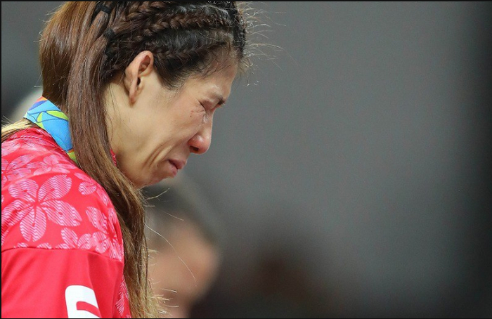 5.女子自由式摔跤53公斤级比赛中日本选手吉田沙保里不敌美国选手马洛里斯,在领奖台上身挂银牌的吉田沙保里落下了眼泪。2016年8月18日,小川昌宏摄于里约卡里奥卡体育馆。