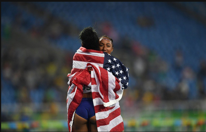 8.女子100米栏决赛夺冠后,美国选手罗林斯激动而欣喜地与铜牌得主同为美国选手的卡斯特林相拥。2016年8月17日,三浦博之摄于里约奥林匹克体育馆。