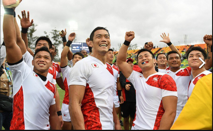 17.男子7人制橄榄球比赛中胜过了肯尼亚队的日本选手们面对现场观众露出了笑容。2016年8月10日,三浦博之摄于里约德奥多罗体育场。