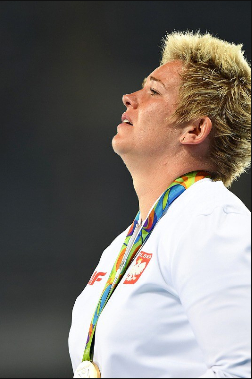 18.女子链球决赛波兰选手沃洛达奇克夺冠,在颁奖仪式上认真听着国歌。2016年8月15日,三浦博之摄于里约奥林匹克体育馆。