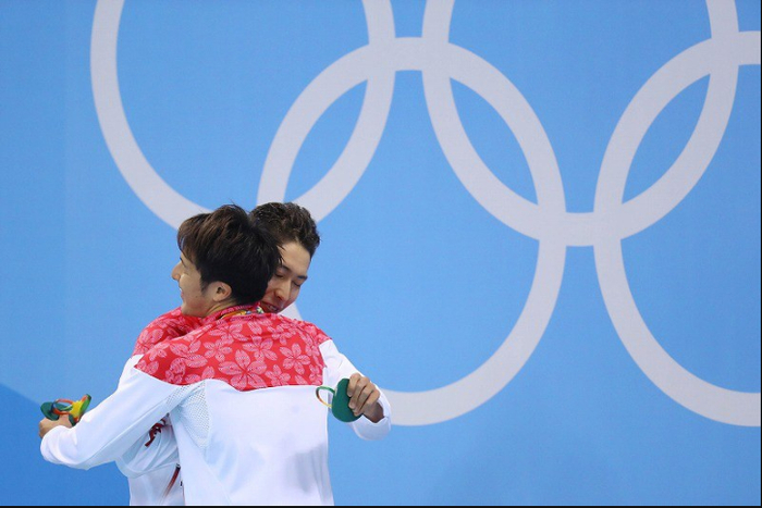 15.男子400米个人混合泳颁奖仪式后,金牌得主日本选手荻野公介拥抱自己的队友——铜牌得主日本选手濑户大也。2016年8月6日,小川昌宏摄于里约奥林匹克水上运动中心。