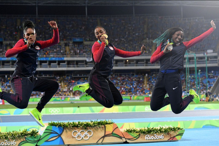 10.女子100米栏决赛,美国选手罗林斯、阿里、卡斯特林包揽金银铜三枚奖牌,图为颁奖仪式上三名选手手持奖牌一跃而起的画面。2016年8月18日,三浦博之摄于里约奥林匹克体育馆。