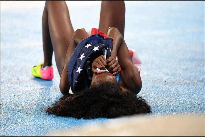 6.女子400米栏决赛,美国选手斯潘塞夺得铜牌,她将国旗牢牢攥在手中感受这份喜悦。2016年8月18日,三浦博之摄于里约奥林匹克体育馆。