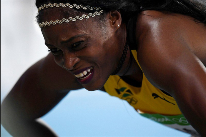 2.女子200米决赛,牙买加新飞人汤普森夺冠后脸上仍有几分痛苦。2016年8月17日,三浦博之摄于里约奥林匹克体育馆。