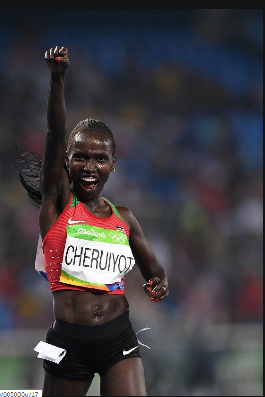 16.女子5000米决赛,肯尼亚老将切鲁约维特爆冷夺冠,脸上难掩欣喜。2016年8月19日,三浦博之摄于里约奥林匹克体育馆。