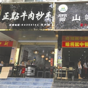 而这家店除了“味将就中餐店”这块招牌,顶上还有一个“雪山快餐”,这个招牌更引人注意。据了解,只有小学文化的戴某本来是在老板手下打工,2016年3月从老板手中接手这家店,每个月的租金1万多元。据知情人士透露,为了扩大影响力,让“场子更大一点”,今年7月份,戴某与隔壁“私家中餐厅”联合,并打通了中间的墙体,两家老板五五分成。