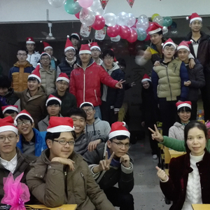 资料图:江建(前排右一)和学生们一起过圣诞节。