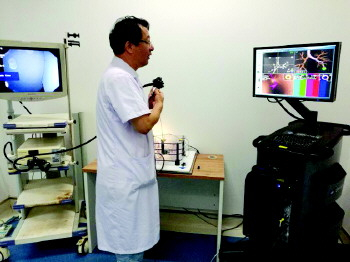 丛波主任在磁导航支气管镜培训中心给学员进行操作培训。本报记者 孔雨童