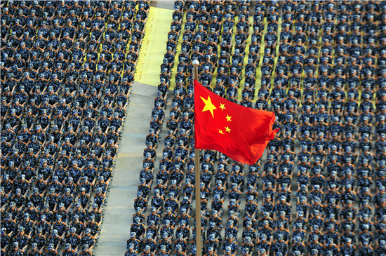 2015年9月16日,山东日照,曲阜师范大学日照校区的开学典礼举行,身着军训服装的大一新生端坐在国旗下。视觉中国供图(资料图片)