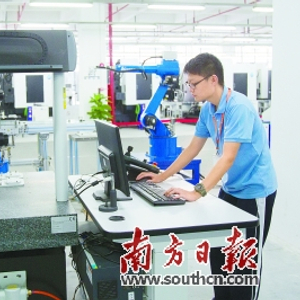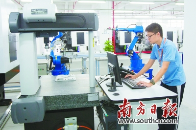 职校学生在劲胜精密的实训基地操作最新的自动化设备。南方日报记者 孙俊杰 摄