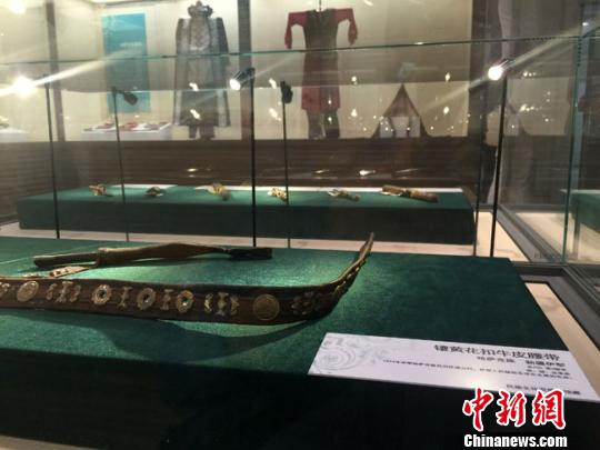 8月30日,“中国穆斯林民族服饰文化展”在甘肃省博物馆启幕。图为展厅陈展的哈萨克族镶黄花扣牛皮腰带。 冯志军 摄