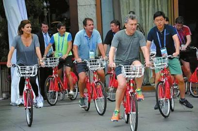 9月5日早上7点30分,前来参加G20杭州峰会的阿根廷总统马克里与夫人从驻地酒店一出来,就骑上了杭州人最熟悉的公共自行车。他们和随行人员共20多人,5日的“早锻炼”就是骑着“小红车”逛西湖。