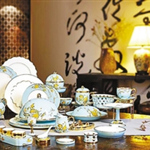 国瓷永丰源董事长刘权辉介绍,“夫人瓷”以晶莹剔透的高档强化瓷作胎体,采用独创的色釉分离技术及国际一流的釉中金工艺,经数次高温烧制,百道工序精琢。在“夫人瓷”设计中,他们选用了中国文化中一些仿生、具有把玩雅趣的元素,试图唤起一种中国式闲情逸趣。