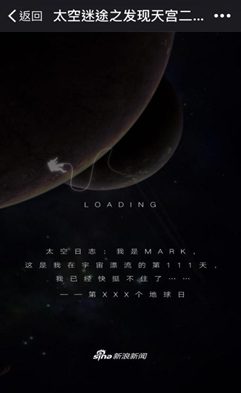 “我是Mark这是我在宇宙漂流的第111天,我已经快挺不住了。——第XXX个地球日”,进入《太空迷途之发现天宫二号》主页面,就会看到来自太空的Mark的太空日志。整个策划产品就是通过主人公Mark的自述展开剧情,俨然一副国际大片上映的前奏。细心的网友在阅读中会发现,产品的背景上除了带有明显的宇宙空间的深邃感,还有一个漂浮着的宇航员形象,这样的细节设计,紧紧贴合了此次天宫神舟载人航天任务主题,也不难看出新浪新媒体实验室在制作上的用心。