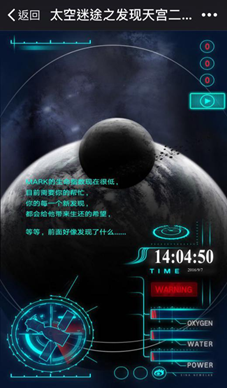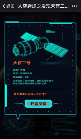随后,页面弹出中国空间实验室“天宫二号”的模型,模拟电影常见的介绍形式,以高科技产品展现的方式介绍了天宫二号的基本信息及特色,并提示:是否准备与天宫二号对接?点击[开始探索],拯救Mark之旅正式开始。