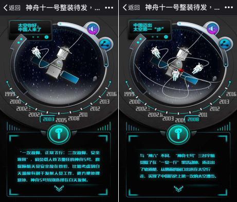 新浪新媒体实验室用时间刻度表作为时间轴,记录了从1999年一直到2016年的神舟故事。每出现一艘飞船,左上角会对应出现它的历史意义,图片也自动变成当时的情形。2003年神舟五号载人上天时,页面就会显示“太空你好,中国人来了”;转眼到了2008年,中国迈出太空第一“步”时,背景图片浩瀚的宇宙中出现中国国旗,让网友的自豪感油然而生。