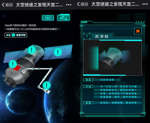进入天宫二号,四个带有感叹号的位置可以点击查看,可以看到对“天宫二号”结构和功能的详细介绍。通过对“天宫二号”的探索,网友会得知“天宫二号”内包含拯救Mark太空舱所需要的物品,点击“进入天宫”,Mark在你的帮助下,顺利进入天宫二号空间实验室。