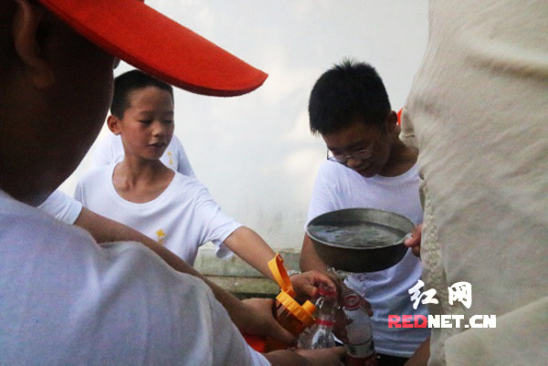 小朋友拿出水瓶装发蒙泉的泉水