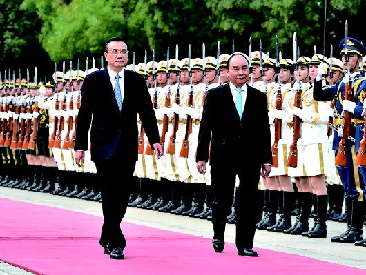 国务院总理李克强12日下午举行仪式,欢迎阮春福访华并与其举行会谈。李克强表示,希望双方继续按照海上、陆上、金融合作“三线并举”的总体思路,推进双边和澜沧江-湄公河次区域发展战略对接。李克强强调,南海问题涉及领土主权和海洋权益,牵涉民族感情。中越双方应共同努力,恪守高层共识,维护海上稳定,努力管控分歧,推进海上合作,不断累积共识,共同维护海上和地区和平稳定,为双边关系平稳发展创造条件。