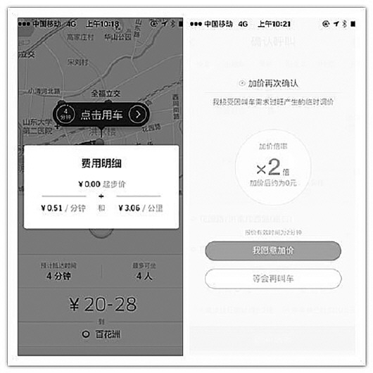 9月15日上午,齐鲁晚报记者专门对网约车平台加价情况做了一个测试。起点为历城区海蔚广场,目的地为大明湖南门。其中,滴滴出租车需要增加8元调度费,滴滴快车临时加价2倍,费用为20元,神州专车预估费用为60元,易到为17元(其中参加充值返现活动相当于11元)。