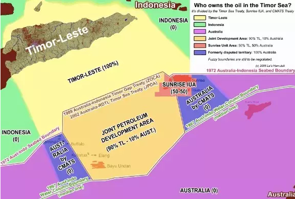 其中,在深黄色区域与右边的蓝色区域交界的那片红色的区域,更是一片富矿区,可澳大利亚却一度打算再与东帝汶签订不平等条约,把这片区域的收益按照澳大利亚82%,东帝汶18%这样划分。只是在东帝汶的强烈抗议下,双方才于2006年同意这里的矿产税按50-50来划分——而这还是在澳大利亚涉嫌派间谍去偷听东帝汶政府的内部会谈,了解了东帝汶底线的情况下!(注:间谍这部分内容澳洲大使馆的信件中同样回避了)